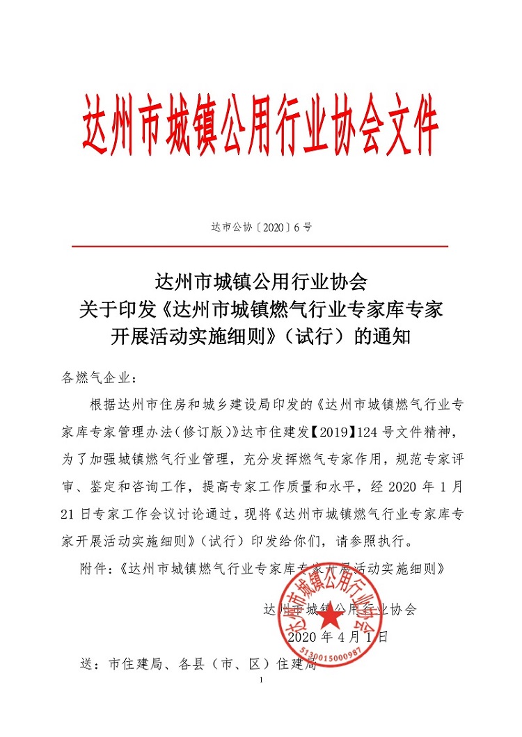 關(guān)于印發(fā)《達州市城鎮(zhèn)燃氣行業(yè)專家?guī)鞂<议_展活動實施細則》(試行)的通知