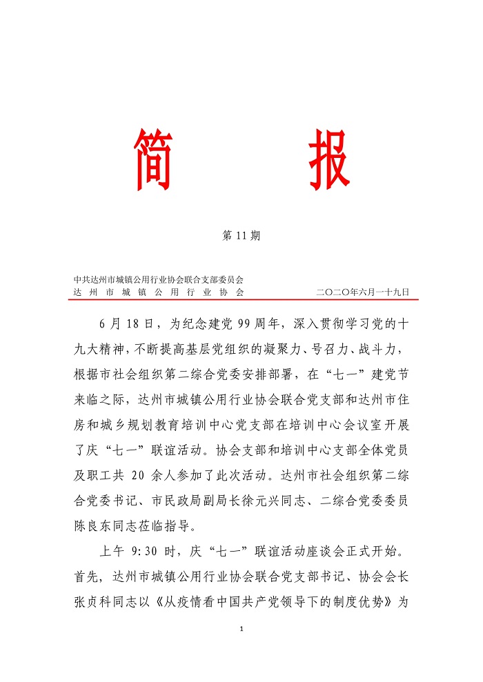 中共達(dá)州市城鎮(zhèn)公用行業(yè)協(xié)會(huì)聯(lián)合支部委員會(huì)2020年第十一期簡(jiǎn)報(bào)