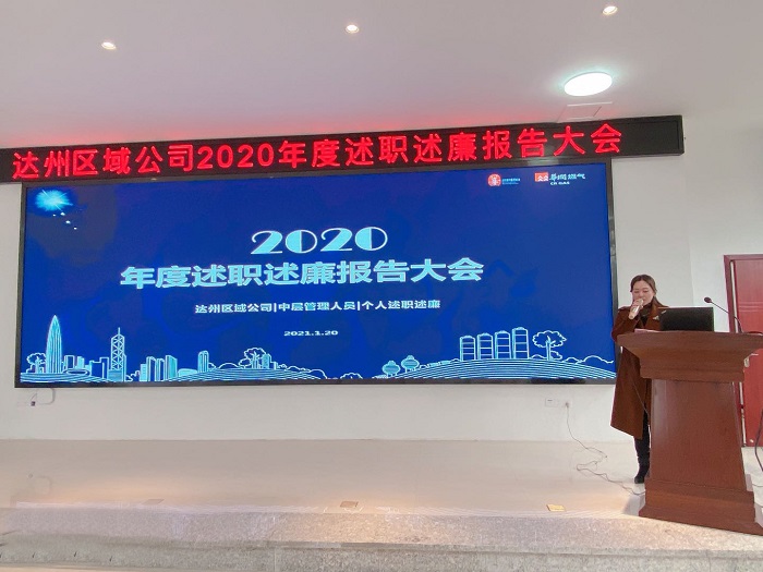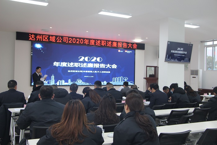 為回首2020、展望2021,全面考核評價中層管理人員履職盡職、廉潔從業(yè)情況,2021年1月20日上午,達(dá)州區(qū)域公司組織召開2020年度述職述廉報告大會。達(dá)州區(qū)域公司管理團(tuán)隊(duì)、特邀嘉賓、中層、主管以及員工代表共計(jì)80余人參加。