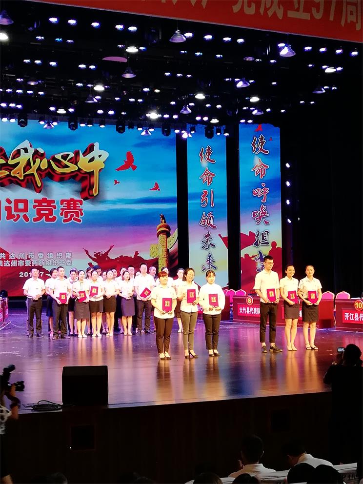 快訊 為慶祝中國(guó)共產(chǎn)黨建黨97周年,7月2日,達(dá)州市兩新組織在巴山大劇院隆重舉行了“黨在我心中”知識(shí)競(jìng)賽決賽。達(dá)州市城鎮(zhèn)公用行業(yè)協(xié)會(huì)聯(lián)合黨支部朱芳玲(四川森博能源有限公司職工),黨建指導(dǎo)員、市委統(tǒng)戰(zhàn)部經(jīng)濟(jì)科科長(zhǎng)黎秋,市現(xiàn)代物流行業(yè)協(xié)會(huì)副書記向琦等三同志代表市社會(huì)組織第二綜合黨委參加了知識(shí)競(jìng)賽決賽,通過(guò)緊張激烈的競(jìng)賽,獲得了二等獎(jiǎng)的優(yōu)異成績(jī),為社會(huì)組織第二綜合黨委和本單位爭(zhēng)得了榮譽(yù)。