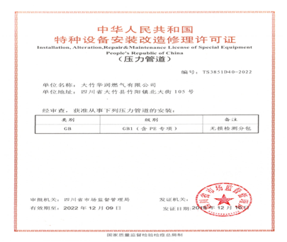 12月10日, 公司成功取得由四川省市場監(jiān)督管理局頒發(fā)的GB類GB1(含PE管專項)特種設備安裝改造修理許可證。