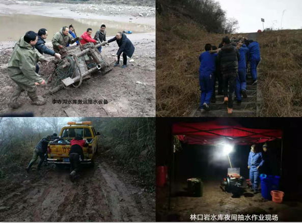 2月15日,李寺溝庫(kù)區(qū)水位下降至底閥以下,剩余水量不足3萬(wàn)立方米!胡家水廠迅速組織抗旱應(yīng)急小組成員到李寺溝水庫(kù)安裝發(fā)電機(jī)、水泵、帳篷等設(shè)備,并安排輪流值班進(jìn)行24小時(shí)無(wú)間斷抽水作業(yè),2月23日,李寺溝水庫(kù)全部庫(kù)存水量告罄。這意味著,如果再不降雨,如果再無(wú)可用水源,胡家鎮(zhèn)將面臨斷水的危境。公司領(lǐng)導(dǎo)、胡家水廠一班人,與胡家鎮(zhèn)政府領(lǐng)導(dǎo)一起翻山越嶺四處尋水,三灣大塘、長(zhǎng)溝水庫(kù)、藍(lán)草河水庫(kù)、鴨池寺山坪塘……凡是有塘庫(kù)的地方就有尋水的足跡。功夫不負(fù)有心人,經(jīng)過幾天艱辛尋找,徒步百余公里,終于找到黑灘上游林口巖水庫(kù)有約8萬(wàn)立方米存水,但必須利用機(jī)電設(shè)備進(jìn)行抽取才能使用。
