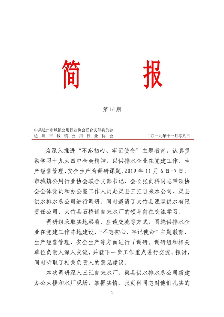 中共達(dá)州市城鎮(zhèn)公用行業(yè)協(xié)會(huì)聯(lián)合支部委員會(huì)2019年第十六期簡(jiǎn)報(bào)